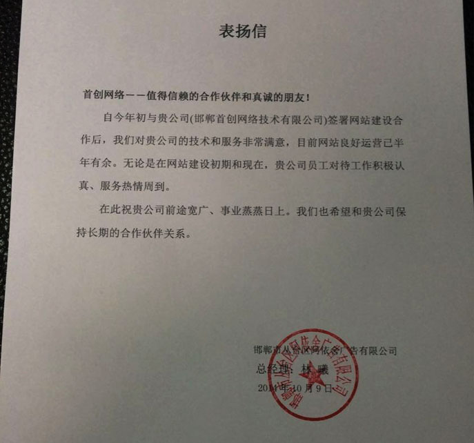 自今年初與貴公司(邯鄲首創(chuàng)網(wǎng)絡(luò)技術(shù)有限公司)簽署網(wǎng)站建設(shè)合作后,我們對貴公司的技術(shù)和服務(wù)非常滿意,目前網(wǎng)站良好運(yùn)營已半年有余。無論是在網(wǎng)站建設(shè)初期和現(xiàn)在,貴公司員工對待工作積極認(rèn)真、服務(wù)熱情周到。