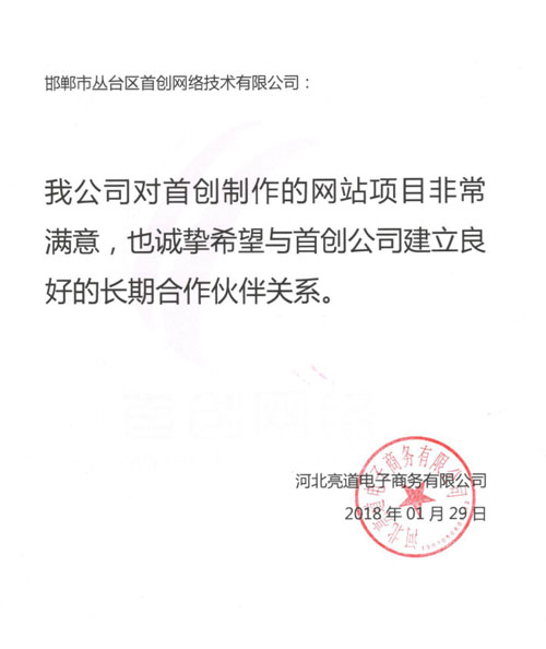 我公司對首創(chuàng)制作的網(wǎng)站項目非常滿意,也誠摯希望與首創(chuàng)公司建立良好的長期合作伙伴關系。