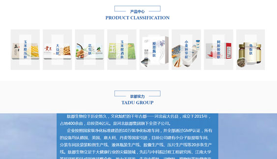 河北肽都生物科技有限公司位于歷史悠久,文化燦爛的干年古都一一河北省大名縣,成立于2015年,占地400余畝,總投資4億元。是河北肽都集團(tuán)旗下全資子公司。企業(yè)按照國(guó)家級(jí)凈化標(biāo)準(zhǔn)建造的10萬(wàn)級(jí)凈化標(biāo)準(zhǔn)車間,并全部通過(guò)GMP認(rèn)證,所有的設(shè)備均從德國(guó)、美國(guó)、意大利、丹麥等國(guó)家引進(jìn),目前公司建有小分子肽提取車間、分裝車間及袋裝粉劑生產(chǎn)線、液體瓶裝生產(chǎn)線、膠囊生產(chǎn)線、壓片生產(chǎn)線等20多條生產(chǎn)線。肽都生物立足于大健康行業(yè)的尖端領(lǐng)域,先后與中科院過(guò)程工程研究所、江南大學(xué)等科研機(jī)構(gòu)達(dá)成深度戰(zhàn)略合作。致力于研發(fā)、生產(chǎn)中藥肽、動(dòng)物肽、植物肽等小分子活性肽產(chǎn)品。