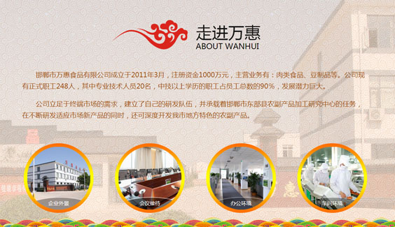 邯鄲市萬惠食品有限公司成立于2011年3月,2014年8月動工興建,2016年12月完成建設(shè)任務(wù),公司占地32畝,建筑面積1.2萬平方米,其中生產(chǎn)廠房5000平方米,倉儲5000平方米。2017年2月購進(jìn)原料清洗設(shè)備、烘焙設(shè)備、包裝設(shè)備等生產(chǎn)線2條,是一家專業(yè)生產(chǎn)肉脯、豆制品、鹵制品的專業(yè)生產(chǎn)企業(yè)。